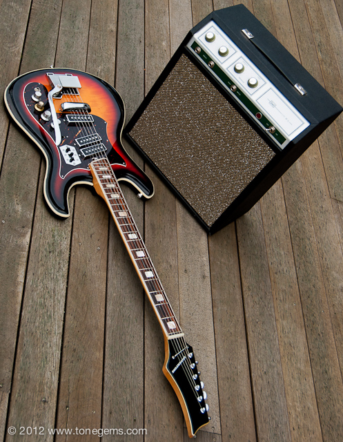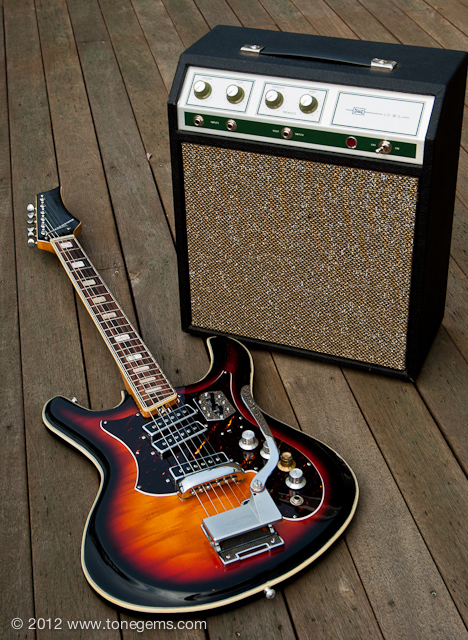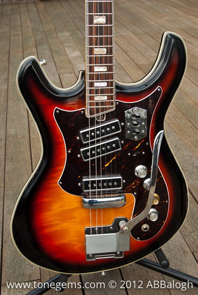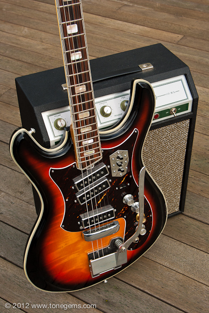 The Silvertone 1445 first appeared in the Sears catalog in 1968, and hung around in a few variations through the early 1970′s. It has three very loud single-coil (“Hound Dog”) pickups wired in series just like the old Danelecto models. The fast, low-profile solid Maple neck with Rosewood fingerboard sports medium to low action and is easy to play. The growling Teisco “Hound Dog” single-coils have lots of bite, and the solid poplar body has plenty of sustain. Of course, the single-coils and non-shielded wiring can be a bit noisy if you’re not careful, but easy to avoid. And I must say that the hand-painted sunburst finish over the flamed Maple; the contoured German carve body with tortoise shell pickguard; and intricate triple-layer celluloid binding makes this guitar a stunning sight to see.