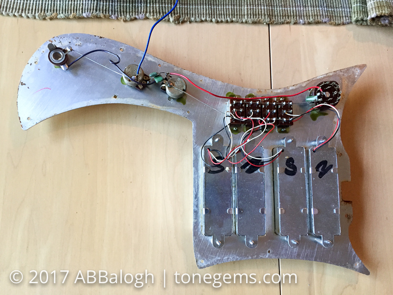 Detailed tear down photos of a 1969 Silvertone 1437 electric guitar, pick guard, pickups and electronics.