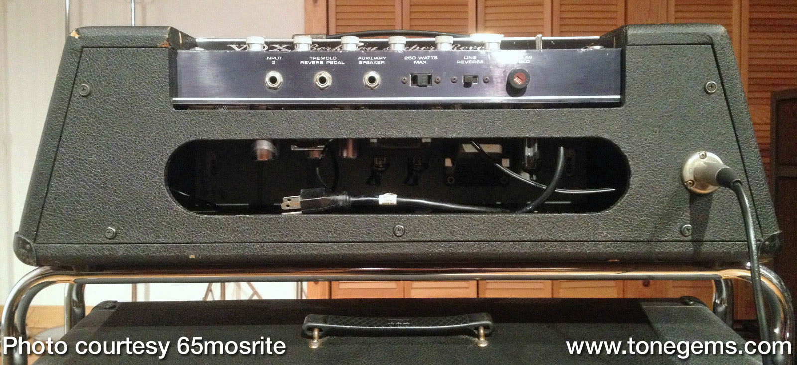 Amp has been completely recapped with Sprague Atoms and high-temp Japanese Nichicon caps bypassing the old can cap that has been left in place for aesthetics – no holes drilled for anything. I’ve only used existing screws to mount the Nichicons on a period correct NOS tag strip. NOS carbon comp cathode resistor installed, along with precisely matched carbon comp grid resistors – all left at original values. I’ve left the original fully-working coupling caps in place for that authentic vintage Vox tone. I’ve installed a 10W Dale 100ohm resistor to knock down the B+ to acceptable levels (AC line voltages are a little higher than they were in the 60’s)- this keeps the EL84’s within operating specs for longer life. The “Death cap” line reverse cap has been removed so you don’t have to worry about possible instant death or shock when you touch your amp or guitar;) Vintage Sylvania and Raytheon preamp tubes, vintage Sylvania rectifier, and new matched pair of Electro Harmonix EL84’s. New preamp tube retainers.